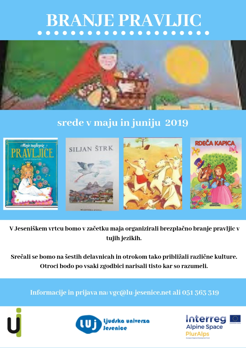 V okviru pilotne aktivnosti projekta PlurAlps bomo izvedli šest delavnic z naslovom “Branje pravljic v tujih jezikih”, na katerih bomo otrokom iz Jeseniškega vrtca približali kulturo različnih narodov. Po branju pravljic bodo otroci imeli nalogo slišano narisati.