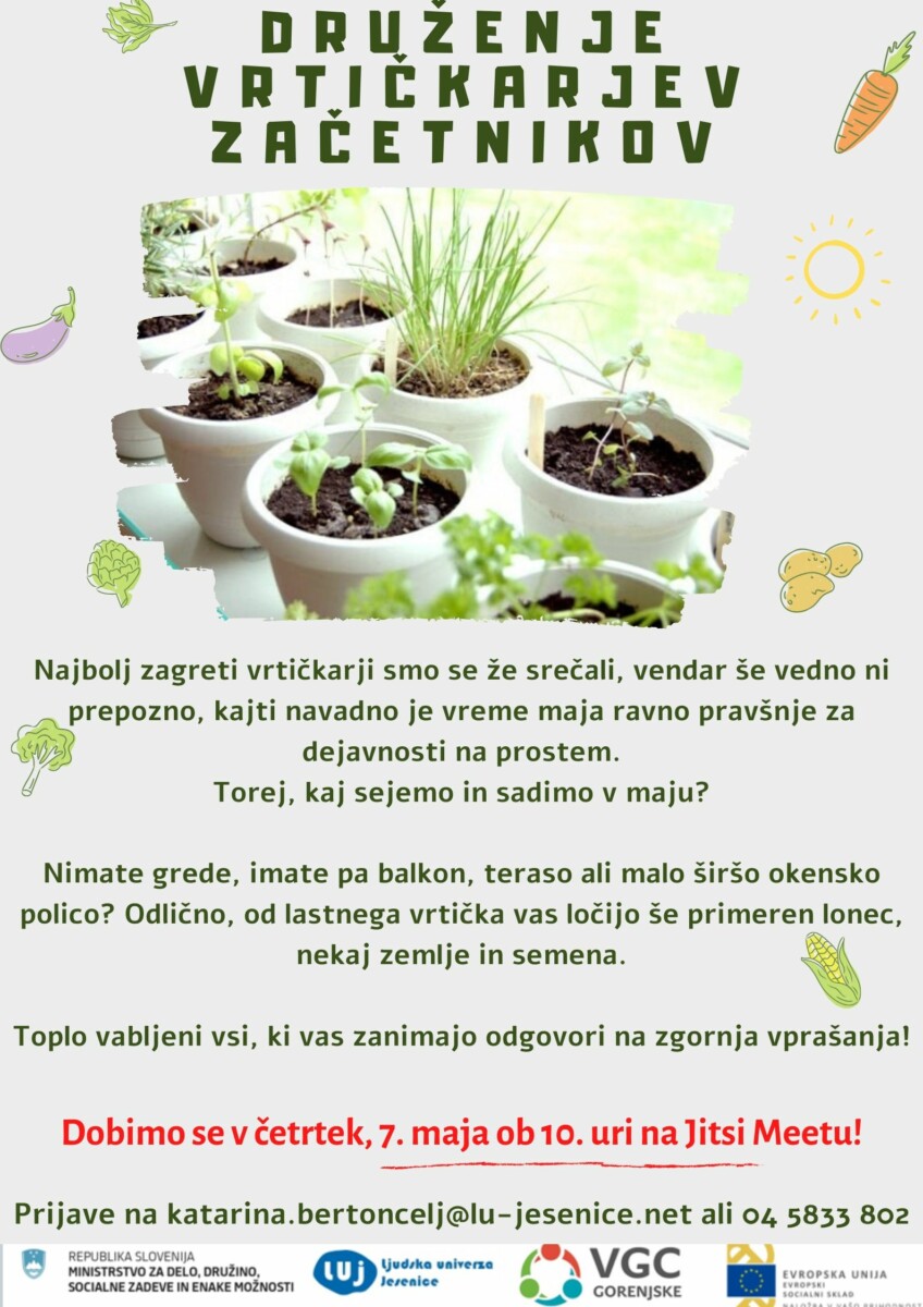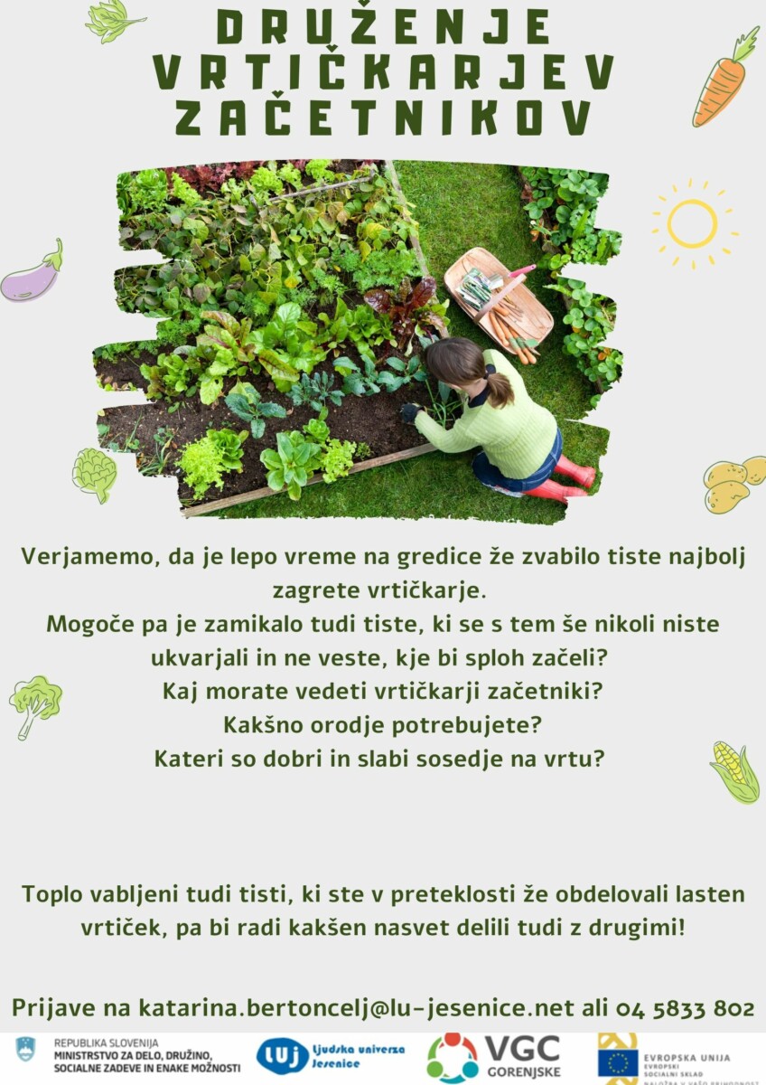 Verjamemo, da je lepo vreme na gredice že zvabilo tiste najbolj zagrete vrtičkarje. Mogoče pa je zamikalo tudi tiste, ki se s tem še nikoli niste ukvarjali in ne veste, kje bi sploh začeli? Kaj morate vedeti vrtičkarji začetniki? Kakšno orodje potrebujete? Kateri so dobri in slabi sosedje na vrtu? Toplo vabljeni tudi tisti, ki ste v preteklosti že obdelovali lasten vrtiček, pa bi radi kakšen nasvet delili tudi z drugimi!