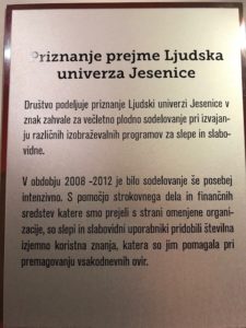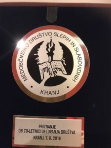 Poleg tega smo 7. 6. 2018 na slavnostni prireditvi ob 70. letnici delovanja Medobčinskega društva slepih in slabovidnih Kranj prejeli priznanje za naše delo s slepimi in slabovidnimi.