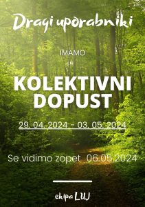Od ponedeljka, 29. aprila do petka, 3. maja imamo kolektivni dopust. Z vami smo ponovno v ponedeljek, 6. maja 2023.