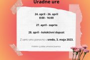 V naslednjem tednu imamo spremenjen delovni čas. Vidimo se spet v sredo, 3. maja 2023. Aktivnosti na LU Jesenice lahko preverite na sledeči povezavi. ... » » » |