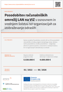 Cilji projekta: Namen projekta Posodobitev omrežij LAN na VIZ je posodobiti računalniška omrežja; pregled obstoječega stanja, izdelava načrta posodobitve, izvedba posodobitve – nadgradnja aktivne in pasivne opreme v osnovnem in srednjem šolstvu ter na organizacijah izobraževanja za odrasle. Skupna vrednost programa znaša 5.533.333,81 €, sredstva mehanizma za okrevanje in odpornost znašajo 4.605.647 €.