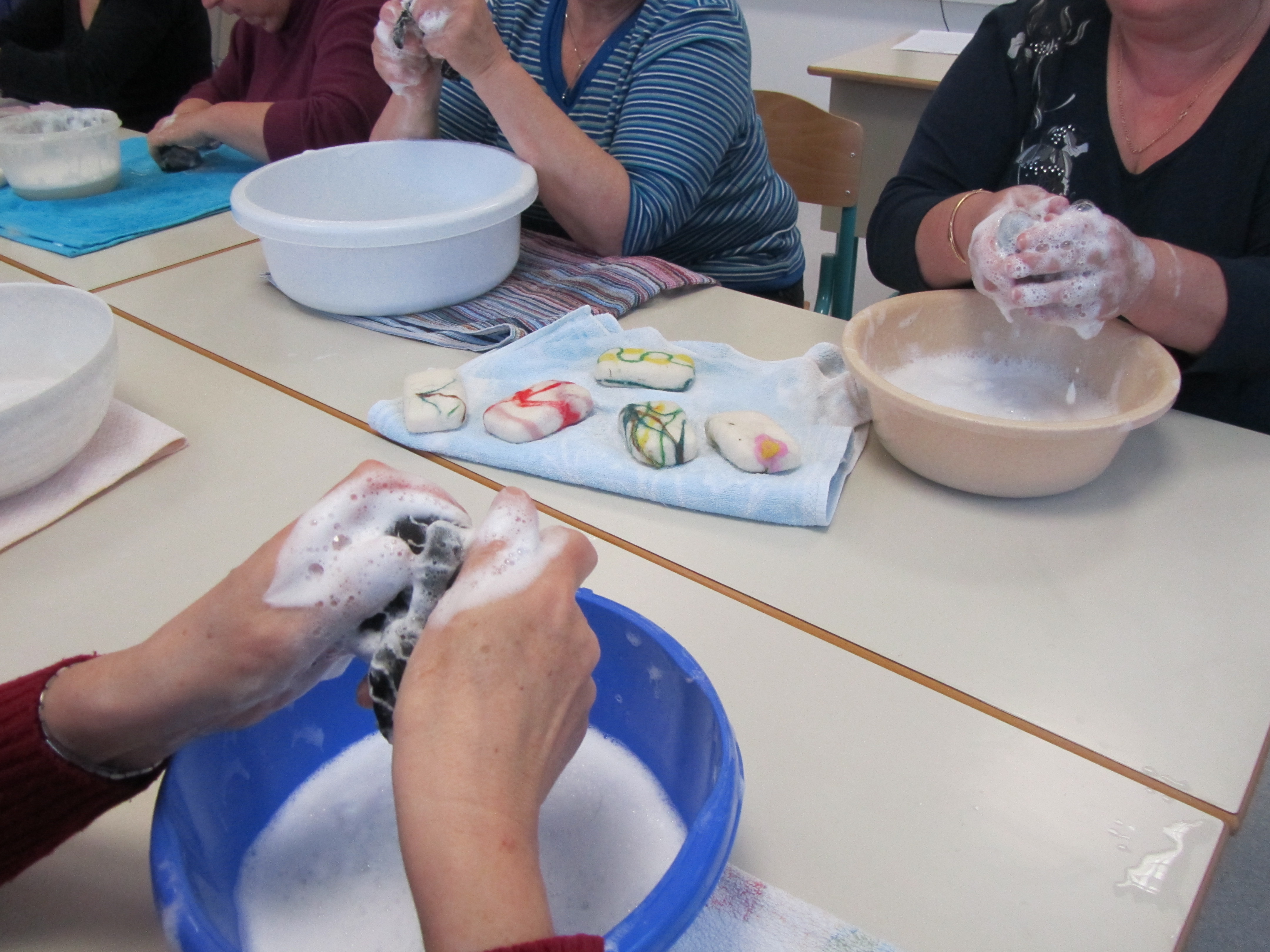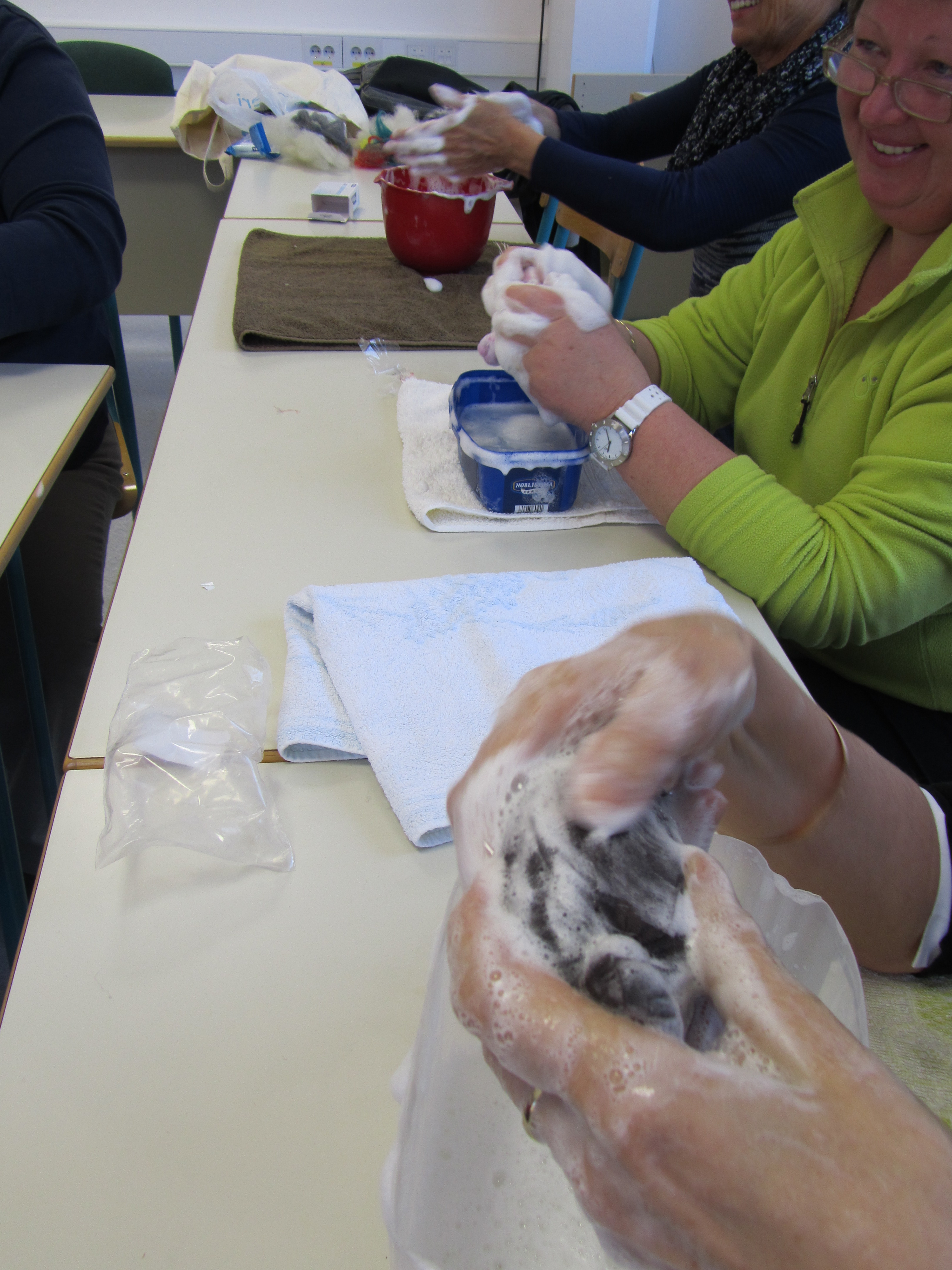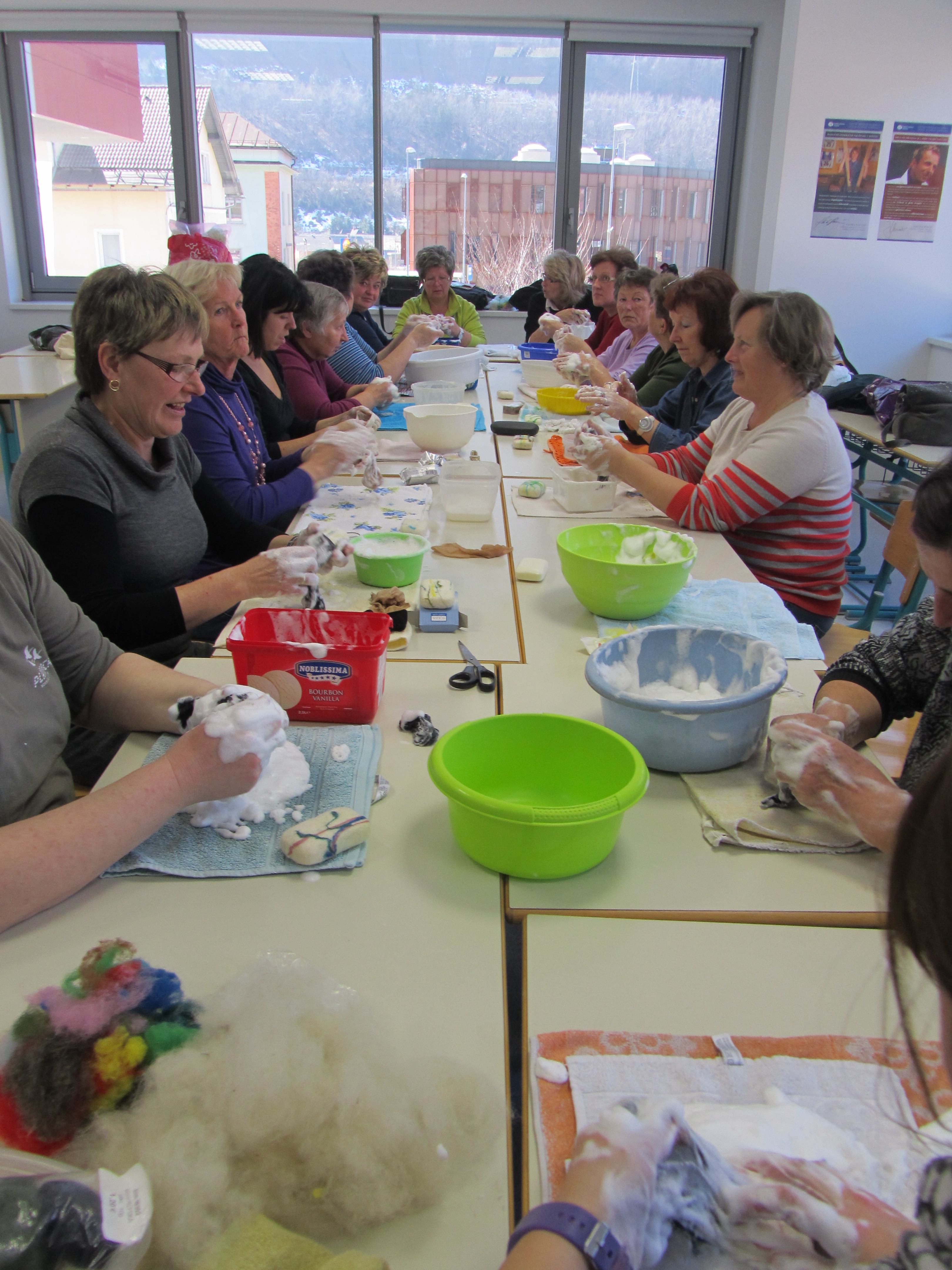 Prijetno ustvarjalno vzdušje udeležencev kreativne delavnice, na kateri so izdelovali filcano milo.